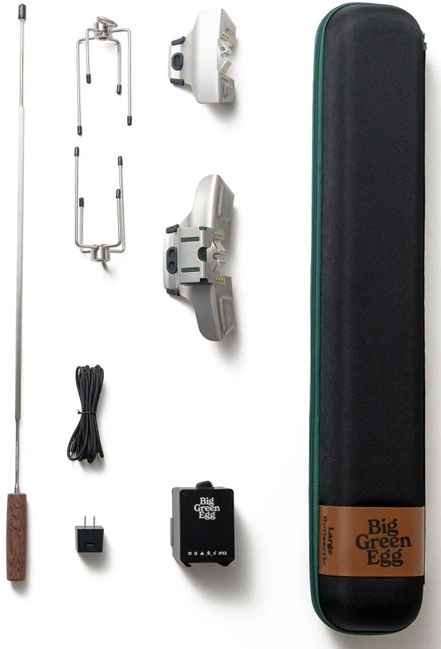 Experience live-fire flavor with the Big Green Egg Large Rotisserie. Compatible with your Large Egg, the Rotisserie transforms your Egg into a self-basting, hands-free roaster, delivering crispy, juicy, and evenly cooked meats with rich, live-fire flavor. Made from premium marine-grade stainless steel, this accessory ensures juicy, tender, and perfectly cooked meats every time.Read More